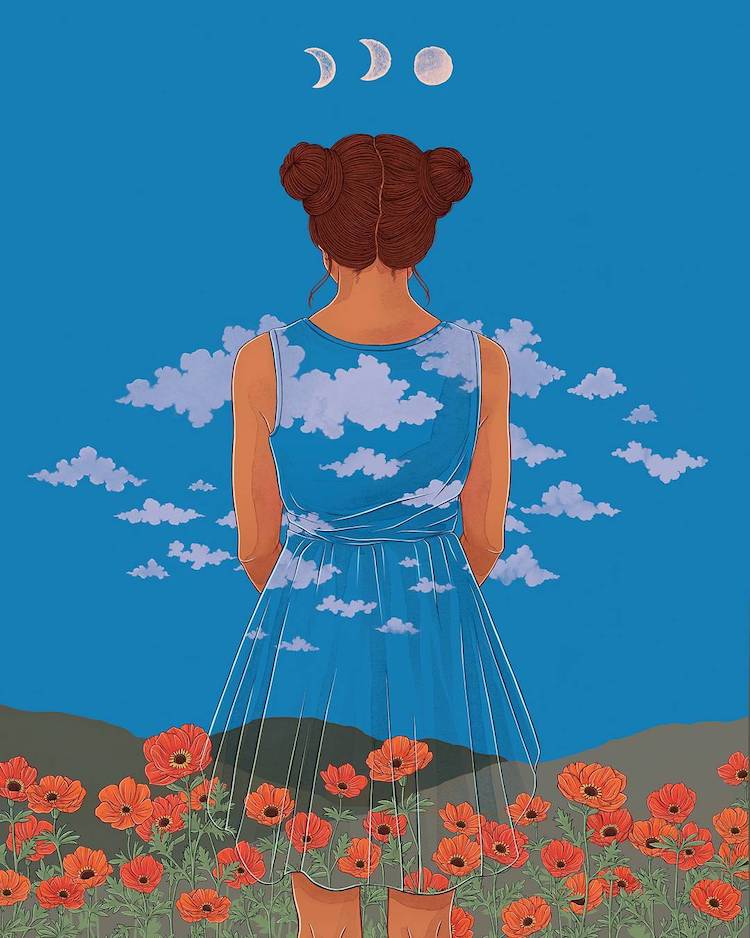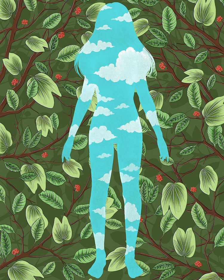 Inspired by “all things decorative and surreal,” illustrator Stephanie Singleton creates images that incorporate floral beauty with subject matter bordering on the bizarre. I especially enjoy her portraits of people that explore the element of emptiness. A face of a person is replaced with the sky, while the outline of a dress reflects the environment around it. These beguiling pieces are as thought-provoking as they are lovely.